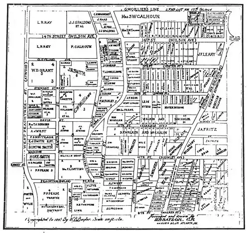 - ↑ "Suburbs will not be annexed now: The Rice measure tabled by Council yesterday afternoon", Atlanta Constitution, October 27, 1897. North Atlanta was defined as the area including today's Midtown between Myrtle St. in the Midtown Historic District and Cherry St., now inside the Georgia Tech campus, as far north as 14th St (then called Wilson Ave.); most of what is now the Georgia Tech campus, south of what was then 5th Street; and the area west of Georgia Tech, south of Jefferson St., as far west as Ashby St. (now Lowery Blvd.), including today's English Avenue neighborhood.