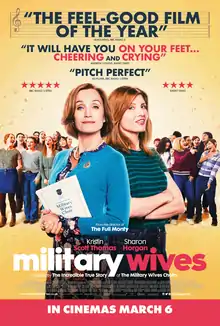 Military Wives is a 2019 British comedy-drama[3] film directed by Peter Cattaneo, from a screenplay by Rosanne Flynn and Rachel Tunnard. It stars Kristin Scott Thomas, Sharon Horgan and Jason Flemyng. The film is inspired by the true story of the Military Wives Choirs, a network of 75 choirs in British military bases across the United Kingdom and overseas, featured in the fourth season of the British documentary television series The Choir.