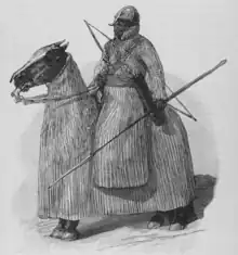 A depiction of a horseman from the Hausa state of Kano wearing lifidi (cotton-padded armour)