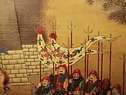 Although armour never lost all meaning during the Ming dynasty, it became less and less important as the power of firearms became apparent. It was already acknowledged by the early Ming artillery officer Jiao Yu that guns "were found to behave like flying dragons, able to penetrate layers of armor."[80] Fully armoured soldiers could and were killed by guns. The Ming marshal Cai was one such victim. An account from the enemy side states, "Our troops used fire tubes to shoot and fell him, and the great army quickly lifted him and carried him back to his fortifications."[81] It is possible that Chinese armour had some success in blocking musket balls later on during the Ming dynasty. According to the Japanese, during the Battle of Jiksan, the Chinese wore armour and used shields that were at least partially bulletproof.[82] Frederick Coyett later described Ming lamellar armour as providing complete protection from "small arms", although this is sometimes mistranslated as "rifle bullets".[83] English literature in the early 19th century also mentions Chinese rattan shields that were "almost musket proof",[84] however another English source in the late 19th century states that they did nothing to protect their users during an advance on a Muslim stronghold, in which they were all invariably shot to death.[85]