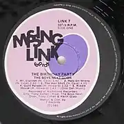 In 1978 the label signed The Boys Next Door, a punk band featuring Nick Cave, Mick Harvey, Phill Calvert and Tracy Pew for whom Glass was also the manager.[2][5] In 1980, the band renamed themselves as The Birthday Party.[5] They became the flagship of the label, recording three albums and being licensed all around the world, with the single "Release the Bats" reaching #1 on the UK Alternative charts.[3] Other notable local artists released by Missing Link Records include Bleeding Hearts,[6] The Go-Betweens,[7] Whirlywirld,[8] The Laughing Clowns and Dynamic Hepnotics.[2][9] The label continued to release 1960s retrospectives, local Australian contemporary punk and new wave, and licensed material from overseas. International licensed releases included those by Snakefinger, The Residents and Dead Kennedys.[4]