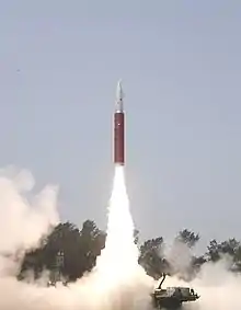 The anti-satellite missile lifting off on 27 March 2019 from Abdul Kalam Island as part of Mission Shakti.