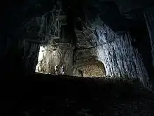 454 caves have been identified over an area of 2.8 km2, and form two networks under this small area. To the north, the trou des Auges, ressaut de 108 m, trou des Filous, grotte Arva, and Cuvée des Ours connect with the Granier system, located in the center of the plateau, to form a 55.725 km network over a depth of 635 meters.[3] The latter consists of the Gros trou Bib, trou des Panaches, gouffre des Myriades, Étoile du Berger, trou Lilou and trou Mathieu for its main cavities. To the south, the system Balme à Collomb-grotte des Pincherins of 8,336 metres (27,349 ft) for 283 metres (928 ft) of elevation gain, now well known for its cave bear deposit[4] has to date not been connected to the Granier system. On November 13, 1988, cavers Pierre Guichebaron and Marc Papet discovered an extension to the Balme à Collomb cave on the west side of the mountain at an altitude of 5,577 feet (1,700 meters) that contained the skeletons of over 1,000 cave bears that date between 24,000 and 45,000 years. The current Granier massif is a remnant of a previously larger plateau reduced by erosion.