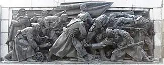 The Monument to the Soviet Army (Bulgarian: Паметник на Съветската армия, Pametnik na Savetskata armiya) is a partially dismantled monument located in Sofia, the capital of Bulgaria. There is a large park around the statue and the surrounding areas. It is a popular place where many young people gather. The monument is located on Tsar Osvoboditel Boulevard, near Orlov Most and the Sofia University. It portrays a soldier from the Soviet Army as a freedom fighter, surrounded by a Bulgarian woman, holding her baby, and a Bulgarian man. There are other, secondary sculptural composition parts of the memorial complex around the main monument, like the group of soldiers which have been used many times as a canvas by political artists. The monument was built in 1954 on the occasion of the 10th anniversary of the liberation by the Soviet Army, which is the general Russian interpretation of the complex military history of Bulgaria during World War II.