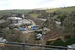On 15 May 1901 passenger trains from Looe were diverted over the new loop line to Liskeard railway station and Moorswater station closed to passengers.[1] Goods traffic has continued – on and off – up to the present day. A siding for the Cheesewring Quarry Company opposite the station was later used by the Cornwall County Council as a road maintenance depot until 1964. Beyond the station another siding lead into the china clay works of the St Neots China Clay Company where china clay was processed that was brought down from Bodmin Moor by pipeline before being dispatched as powder to Looe or, later, Fowey. This was opened in 1904 and closed in the 1990s but the site has since been used as a cement distribution depot and trains are brought in from time to time, the motive power being initially provided by Freightliner but more recently by Colas Rail.