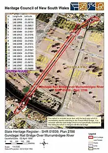 3. 1 2 3 4 5 6 7 8 9 10 11 12 13 14 15 16 17 18 19 20 "Gundagai rail bridge over Murrumbidgee River". New South Wales State Heritage Register. Department of Planning & Environment. H01039. Retrieved 2 June 2018. Text is licensed by State of New South Wales (Department of Planning and Environment) under CC-BY 4.0 licence.