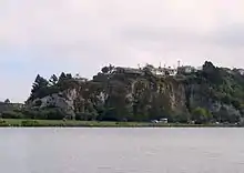 The northern side of the Musselburgh Rise is skirted by another main thoroughfare, Portobello Road. This road joins with the southern end of Portsmouth Drive close to the northeastern point of the rise, and continues across the causeway at Andersons Bay Inlet, though the junction is a limited one, and traffic may not turn right from the Musselburgh part of Portsmouth Drive to continue across the causeway. Close to the junction is a large memorial stone to the Taranaki Māori prisoners of the New Zealand Wars who were transported south to Dunedin, many of whom constructed the causeway and much of Dunedin's foreshore roads as forced labour.[5] A branch railway ran along Portobello Road in this area from the 1870s until 1912, and rail links continued to the suburb until the track were lifted in 1928.[6]