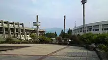 The athletic field with Mount Iizuna in the center left background and the Aqua Wing Arena in the center right