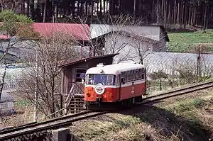 The Nanbu Jūkan Railway was established in 1962 as a private railway by the Nanbu Jūkan Company in 1962 between Shichinohe and Nishichibiki. At first, its construction was subsidized by the municipal governments it would pass through, but it was ultimately funded by a steel company based in the city of Mutsu. The railway was extended to Noheji via the Tōhoku Main Line on 5 August 1968. The railway fell into financial trouble after many people chose to purchase and drive cars instead of riding the railbus; however the railway hoped that they could serve as connecting railway between the planned Shinkansen station at Shichinohe. Plans for the Tōhoku Shinkansen instead placed Shichinohe-Towada Station to the north of the existing station, away from the Nanbu Jūkan Railway. The private railway served the area until 5 May 1997 when railbus services stopped because of maintenance costs. The division of the company was officially closed on 1 August 2002.[1] Shichinohe Station (now the headquarters of Nanbu Jūkan Company), some of the track and a railbus are preserved. The rest of the rail line has been removed or left in a state of decay.[2]