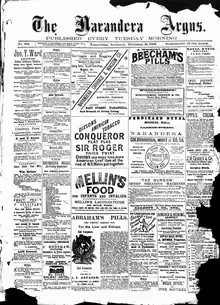 First published in 1880, The Narrandera Argus and Riverina Advertiser was published until 1953 when it changed its title to Narrandera Argus, which is still in publication.[1] It was published by James Ashton from 1892 and later by Donald M'Neil Turner.[2] A rival newspaper, the Narrandera Ensign, was established in 1886. This paper promoted protectionism while the Argus promoted free trade.[3]