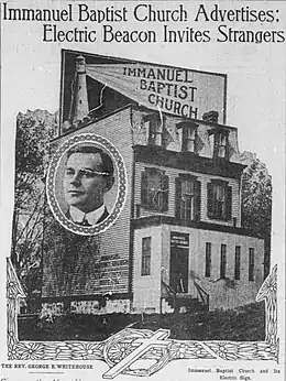 8. 1 2 "Immanuel Baptist Church Advertises: Electric Beacon Invites Strangers; Congregation About Two Years Old Has Bought $30,000 Lot". Washington Times. No. 4, 868. Washington, D.C. 13 October 1907. p. 11 via Chronicling America: Historic American Newspapers, Library of Congress.