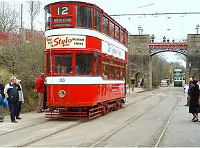 This tram was the one that started the whole preservation movement, being bought by enthusiasts for just £10 in 1949[11](equivalent to £380 in 2021).[14] As the car needed to pass under the medieval Bargate Arch in Southampton, the tram's proportions were altered. It also has knifeboard seating on the top deck for this reason.[15]