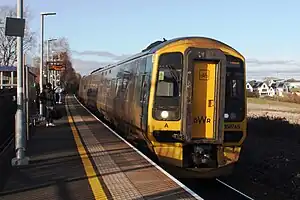 The single platform is 124 metres (407 ft) long and a passenger shelter, ticket machine and customer information system are provided.[10] Pedestrian access is provided from Liberty Way where there is a small drop-off area and disabled parking.[10] Provision has been made for a future underpass crossing.[11]