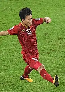Quang Hải gained international reputation in 2019 AFC Asian Cup when he played an instrumental part on Vietnam's amazing run in the tournament, including a stunning free kick goal against Yemen as Vietnam won 2–0, and sneaked into the Knockout rounds. Vietnam defeated Jordan in the Round of 16, but fell short 1–0 to the eventual runners up of the tournament, Japan in the quarterfinals.[29] Still, Quang Hải was named Man of the Match on both Vietnam's wins in the tournament, and was inducted into the tournament's official all-star squad by the AFC Technical Committee.[30][31] On 8 November 2019, he defeated Chanathip Songkrasin of Thailand to win the AFF's Men Player of the year, an award for the best Southeast Asian player in recent 2 years.[32]