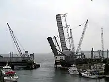 In 2010, construction began on a new fixed-trunnion bascule bridge to replace the 1907 span, in an ARRA-funded project.[7] Located 58 feet (18 m) south of the old bridge, on the approximate alignment of the pre-1907 swing span, the new structure provides 100 feet (30 m) of horizontal clearance, and 16 feet (4.9 m) of closed vertical clearance at mean high water.[8] As part of the project, Amtrak also replenished the beachfront and replaced the Niantic Bay Boardwalk, which had been damaged in storms several years before.[1]