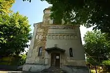 The structure is trefoil in shape, built of stone and brick. The spire resembles those of early Moldavian churches. In 1814, the archimandrite of the day restored the church, adding a closed foyer with a door and four windows, on top of which a bell tower was built.[1] There are four bells, one of which was cast at Brașov in 1790.[2] The exterior decoration is sparse, confined to niches and buttresses. The nave has an arched ceiling with an octagonal gap for the spire, while the altar space is a quarter-sphere.[1] In 1926, part of the parish house was rebuilt and the interior painted;[2] the church suffered damage during the 1940 Vrancea earthquake. During the subsequent repairs, the upper part of the walls was whitewashed; the painting was not of high quality, as can be discerned from what remains. By contrast, the 19th-century iconostasis is beautifully carved and features five rows of well-crafted icons. Other valuable objects in the church include two Gospel books, one decorated in silver, another in silvered velvet; the royal doors; the stand for the Virgin Mary's icon; icons of Ss. Barbara and Charalambos; old liturgical books finely typed. To the south of the church, there is a building that once served as the archimandrite's residence,[1] dating to 1858;[2] later a primary school, it is now a kindergarten.[1] No old inscriptions survive, only one in Greek above the entrance recording the 1814 expansion.[2]