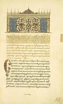 Nikon produced two major compilations of ecclesiastical texts: the Pandektai (Pandects), a collection of conciliar and patristic writings on canon law for wandering monks, and the Taktikon, a collection of forty chapters of authoritative texts on liturgical problems.[2] The Pandektai was written while he was still on the Black Mountain.[1] It contains one episode cited to the Euthymiac History, which is one of only two surviving excerpts from this otherwise lost work.[4] The Taktikon includes a typikon initially intended for the community he founded, but they rejected it and the community disbanded.[1] The typikon was taken up by the monastery of the Virgin of the Pomegranate.[2] From the 13th century, the Taktikon was the main authority in Russian monasticism.[1]