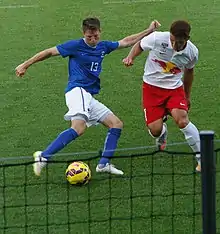 Noah Franke attempted to dribble past Hwang Hee-chan during a match between Creighton Bluejays and Red Bull Salzburg in 2015.