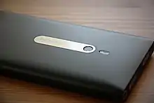 Lumia 800 shares its design with the previously released MeeGo-based Nokia N9 and it was originally Meego CDMA-variant for Verizon with codename RM-716 Searay.[11] The outward differences are one added physical button dedicated to the camera on the right side of the phone, and a dual LED flash moved directly above the Carl Zeiss camera lens.[12] Despite a similar exterior, the Lumia 800 has a different interior than N9. Lumia 800's chipset comes from Qualcomm, whereas the N9 is based on a Texas Instruments OMAP chipset and CPU.[13][14] Like the N9, it has a convex-curved Gorilla Glass AMOLED PenTile screen with a ClearBlack antiglare filter. The screen diagonal is 3.7 inches (800 x 480 pixels), compared with 3.9 inches (854 x 480 pixels) for N9, to conform with the Windows Phone specifications list, which includes three capacitive softkeys placed under the glass. A through-colored unibody shell is made from polycarbonate plastic.[1]