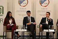 The last session of EaP&V4 Countries Countering Disinformation forum hosted by the Europe-Georgia Institute titled Disinformation and the Youth Resilience: Forging a New Generation of Leaders. from left to right: Eto Buziashvili, International Security Expert, (Georgia); Polad Muradli, Baku-based Independent Expert (Azerbaijan); George Melashvili, President of the Europe-Georgia Institute (Georgia).