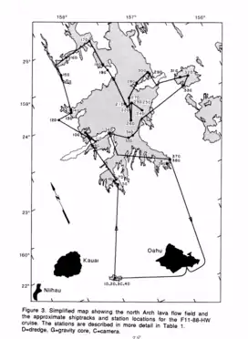 - 1 2 3 Clague, David A.; Uto, Kozo; Satake, Kenji; Davis, Alicé S. (2002). "Eruption style and flow emplacement in the Submarine North Arch Volcanic Field, Hawaii". Hawaiian Volcanoes: Deep Underwater Perspectives. Geophysical Monograph Series. Vol. 128. pp. 65–84. doi:10.1029/GM128p0065. ISBN 0-87590-987-6.