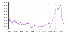 The North Dakota oil boom was the period of rapidly expanding oil extraction from the Bakken Formation in the state of North Dakota that lasted from the discovery of Parshall Oil Field in 2006, and peaked in 2012,[1][2] but with substantially less growth noted since 2015 due to a global decline in oil prices.[3] Despite the Great Recession, the oil boom resulted in enough jobs to provide North Dakota with the lowest unemployment rate in the United States from 2008 to at least 2014.[4][5] The boom gave North Dakota, a state with a 2013 population of about 725,000, a billion-dollar budget surplus. North Dakota, which ranked 38th in per capita gross domestic product (GDP) in 2001, rose steadily with the Bakken boom, and had a per capita GDP 29% above the national average by 2013.[6]