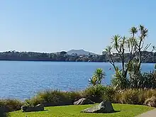The North Shore is home to the northernmost features of the Auckland volcanic field. Lake Pupuke, a volcanic maar located in Takapuna, is one of the oldest known features of the Auckland volcanic field, erupting an estimated 193,200 years ago.[33][34][35] During the eruption of Lake Pupuke, two lava flows travelled eastwards through the area, burning vegetation and encasing the lower 1-2 metres of the tree trunks in lava. The lava solidified into basalt rock, creating the Takapuna Fossil Forest, which was exposed an estimated 7,000 years ago due to coastal erosion.[36]