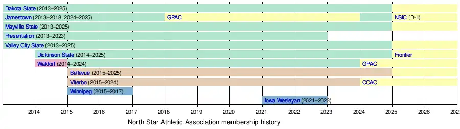 • 2025 – The NSAA will disband following the conclusion of the 2024-25 athletic season.[2] Jamestown will transition to NCAA Division II and join the Northern Sun Intercollegiate Conference, while Dickinson State will re-join its former home of the Frontier Conference.[8][9] The remaining members (Bellevue, Dakota State, Mayville State, and Valley City State) have not yet announced any plans to join a new conference following the NSAA's dissolution.