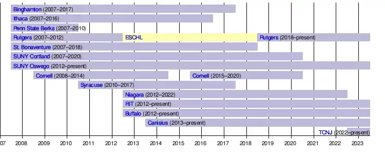 The College of New JerseyCanisius CollegeUniversity at BuffaloRochester Institute of TechnologyNiagara UniversitySyracuse UniversityCornell UniversityCornell UniversityState University of New York College at CortlandSt. Bonaventure UniversityRutgers UniversityEastern States Collegiate Hockey LeagueRutgers UniversityPenn State BerksIthaca CollegeBinghamton University