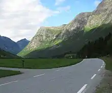 Norwegian County Road 63 (Norwegian: Fylkesvei 63 or Fv63) is a Norwegian county road in Møre og Romsdal county and a very small part in Innlandet county, Norway. It begins at Norwegian National Road 15 along the lake Langvatnet in Skjåk Municipality in Innlandet county and it heads north where it ends at the junction with the European route E136 highway near the town of Åndalsnes in Rauma Municipality, Møre og Romsdal county. The route runs for 103.6 kilometres (64.4 mi) including a single ferry crossing over the Norddalsfjorden. The vast majority of the road is in Møre og Romsdal county, only the southernmost 2.5 kilometres (1.6 mi) lie in the extreme western part of Innlandet county. Both the Langvatnet–Geiranger and Trollstigen sections of the road are closed during winter and spring (usually early November to late May) due to the weather conditions (snow and avalanches).[1] The road passes by a number of notable landmarks, which has led to the earmarking of the route as national tourist route.[2]