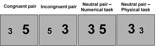 In psychology, the numerical Stroop effect (related to the standard Stroop effect) demonstrates the relationship between numerical values and physical sizes. When digits are presented visually, they can be physically large or small, irrespective of their actual values. Congruent pairs occur when size and value correspond (e.g., large 5 small 3) while incongruent pairs occur when size and value are incompatible (e.g., large 3 small 5). It was found that when people are asked to compare digits, their reaction time tends to be slower in the case of incongruent pairs. This reaction time difference between congruent and incongruent pairs is termed the numerical Stroop effect (or the size incongruity effect; SICE)