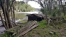 Neverfail Bay with derelict oyster barge and loading ramp (April 2019)