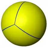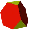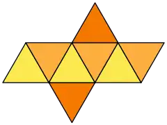 The characteristic tetrahedron of the regular octahedron can be found by a canonical dissection[1] of the regular octahedron which subdivides it into 48 of these characteristic orthoschemes surrounding the octahedron's center. Three left-handed orthoschemes and three right-handed orthoschemes meet in each of the octahedron's eight faces, the six orthoschemes collectively forming a trirectangular tetrahedron: a triangular pyramid with the octahedron face as its equilateral base, and its cube-cornered apex at the center of the octahedron.[2]