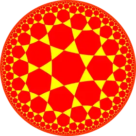 The octahedron as a tetratetrahedron exists in a sequence of symmetries of quasiregular polyhedra and tilings with vertex configurations (3.n)2, progressing from tilings of the sphere to the Euclidean plane and into the hyperbolic plane. With orbifold notation symmetry of *n32 all of these tilings are Wythoff constructions within a fundamental domain of symmetry, with generator points at the right angle corner of the domain.[9][10]