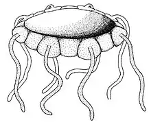 Octomedusa possess 7-8 tentacles that each come from a pentagonal bell. Every tentacle is equal in length however they may vary but never exceed the diameter of the cnidarian body. A narrow velum (velarium) is present in the organism and is 1 millimeter (0.039 in)-1 millimeter (0.039 in) in width. The large manubrium, represented by a square-central impression about 1 millimeter (0.039 in), contains a cruciform mouth.[1] A smooth and scalloped margin are present in specimens, however they were proven to be the result of artefacts made from preservation.[6] Each tentacle has a length of 4 millimeters (0.16 in)-10 millimeters (0.39 in). The preserved remains of the organism are so general that they were originally not able to be assigned to either the true jellyfish or the hydroids.[1]