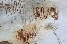 - ↑ Cooke, Julia; Edwards, Ted (2007). "The behaviour of scribbly gum moth larvae Ogmograptis sp. Meyrick (Lepidoptera: Bucculatricidae) in the Australian Capital Territory". Australian Journal of Entomology. 46 (4): 269–275. doi:10.1111/j.1440-6055.2007.00606.x. ISSN 1326-6756.