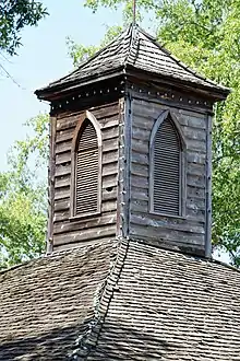 The Old Market is four-sided (24 feet each) open-air shed with a pyramid-shaped roof. There is a steeple at the top containing a bell. Four heavy wooden timbers support each side. A new roof and a cement floor were added to the structure in the 1950s, and the timbers (which are now badly rotted) were reinforced with iron.[5]