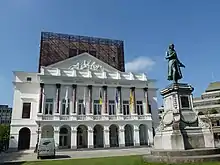 The first stone was laid on 1 July 1818 by Mademoiselle Mars.[1] Built according to the plan of the architect Auguste Dukers, the theatre in the neoclassical style has a massive parallelepipedic shape. Its main façade is decorated with a marble colonnade[alpha 1] limited by a balustrade and overlooking the arcades on the ground floor. The Théâtre royal de Liège was inaugurated on 4 November 1820.