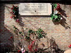 As for the communists, the first organization of the party that was formed in hiding was in Madrid, where just after the end of the war a provincial committee was formed, headed by Matilde Landa and made up of several militants, some of them young members of the JSU. Some of its members were arrested by the police, who had obtained the files of the communist youth organization, being accused without any proof of having been preparing an attack against General Franco for the Victory Parade to be held on May 19, so a military court sentenced them to death and they were shot.[9] Others were accused of being involved in the attack against Major Isaac Gabaldón, when he was traveling in his car near Talavera de la Reina. On August 4 a first summary court-martial was held in Madrid in which 65 of the 67 accused were condemned to death, being shot the following day; 63, among them thirteen young women, some of them minors, who would be known as "Las trece rosas".[10] Matilde Landa was also arrested, as well as Enrique Sánchez and José Cazorla, leaders of the JSU, who had formed the first "delegation of the central committee" —the term used to refer to the clandestine communist leadership of the interior of Spain—, Sánchez and Cazorla were while Landa saw the sentence commuted to 30 years in prison, but in mid-1942 she could no longer withstand the psychological pressure to which she was subjected by the prison guards and the management of the Palma de Mallorca prison and committed suicide.[11] The next attempt of the PCE to provide itself with an underground leadership was the work of Heriberto Quiñones, who escaped from the Albatera camp.[12] Quiñones formed the Interior Committee in May 1941, which also included Luis Sendín and Julio Vázquez —the latter was arrested by the police on July 16, being replaced by Realino Fernández López Realinos, of the Communist Party of Euskadi—.[13] Around the same time, mid-May, several communist cadres sent by the PCE leadership in Mexico arrived in Lisbon to take charge of the organization of the interior.[14] But four months later the Portuguese police arrested the "Lisbon group" and the Spanish police arrested Quiñones' committee along with two hundred more communist militants. Quiñones himself was arrested on December 30, 1941, in Madrid's Alcalá Street along with Ángel Garvín, who had taken the place of Realinos —detained earlier— in the interior leadership. All the captured interior leaders were condemned to death and shot, as well as the members of the "Lisbon group", who had been extradited to Spain, except for one of them who would die in prison in 1947.[15] The reaction of the PCE leadership in exile to this incident was to accuse Quiñones of being a traitor who had denounced his comrades of the "Lisbon group" to the police.[16] To this very serious accusation was added that of "Trotskyist" —the worst label a communist could receive in the times of Stalinist orthodoxy—.[17]