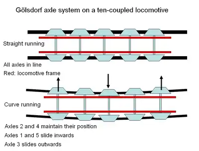 Locomotives of the Gölsdorf design were only suitable for lines, on which there were relatively few and large curvatures. In this case it was sufficient to shift one or more coupling axles sideways in such a way that the movable axles were not guided in their axle bearings but by their own flanges. The bearings of the coupling rods have the same lateral play on their journals as the axles in the axle bearings. This type of construction has proven itself well on eight- and multi-wheel locomotives, but it was not suitable for very small curvatures. In terms of performance and even load distribution, etc., it was equivalent to the more common Klien-Lindner locomotives. They were used for main, branch and small railways.[11]