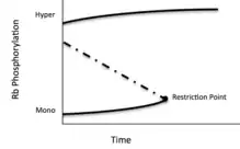 After a cell passes the restriction point, Cyclin E - Cdk 2 hyper-phosphorylates all mono-phosphorylated isoforms. While the exact mechanism is unknown, one hypothesis is that binding to the C-terminus tail opens the pocket subunit, allowing access to all phosphorylation sites. This process is hysteretic and irreversible, and it is thought accumulation of mono-phosphorylated pRb induces the process. The bistable, switch like behavior of pRb can thus be modeled as a bifurcation point:[25]