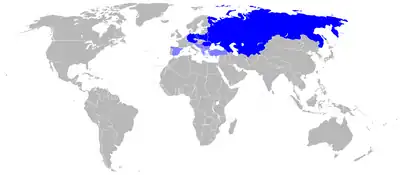 During early 1938, the Polish Air Force started to receive the Łos A variant;[20] it was followed by deliveries of the improved PZL.37B to operational units, which had been slowed by delays in supply of the Pegasus XX engines and other equipment, during the autumn of 1938.[21][22] It was planned that by April 1939, the air force should have 128 aircraft but less than half had been accepted into service and half of those were early production not up to standard and issued to conversion training units.[23] On 1 September 1939, the Polish Air Force had roughly 86 PZL.37s in total, but less than a half of those were used in combat. 36 PZL.37Bs were in four bomber escadres of a Bomber Brigade: the 11th, 12th, 16th and 17th escadres (two escadres with nine aircraft each, constituted a group, in Polish: dywizjon; the PZL.37 were in groups X and XV). The remainder of the Bomber Brigade's aircraft were PZL.23 Karaś. About 50 remaining PZL.37s were assigned to the reserve XX group, training units or in repairs. As a consequence of there only having been a few months available to train the crews and complete the equipping of the bombers, the planes were not fully ready when the war broke out. For example, the extra internal fuel tanks for the type were not yet in service, thus the maximum range of the bomber that had been quoted in specifications was in practice not achievable.[3]