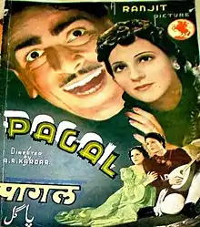 Pagal is a 1940 Indian Hindi-language film. It was the fourth highest grossing Indian film of 1940.[1] The psycho-social melodrama was directed by A. R. Kardar for Ranjit Movietone.[2] Kardar also wrote the dialogues and story (with Kamal Amrohi) for the film. Khemchand Prakash composed the music with lyrics written by D. N. Madhok.[3] The film's protagonist was Prithviraj Kapoor playing a doctor with psychological problems, working in a "lunatic asylum".[4] The rest of the cast included Madhuri, Sitara Devi, Noor Mohammed Charlie, Khatoon, Trilok Kapoor and Sunalini Devi.[5]