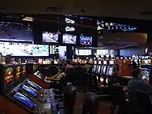 The Palms casino is 94,065 sq ft (8,738.9 m2).[137] Upon opening, it had 2,200 slot machines, keno, bingo, and 55 table games,[22][15] including blackjack and poker.[138] It also featured a sportsbook with seating for more than 200 people. Unlike certain other properties, the Palms sportsbook was built in the center of the casino, intended as a convenient location for locals to find.[139] The book initially did not accept bets on NBA games, due to the Maloof family's ownership of the Sacramento Kings.[3] The betting ban on NBA games was lifted seven years after the Palms' opening.[140]