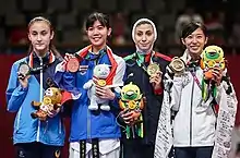 She also represented Thailand at the 2020 Summer Olympics and claimed a gold medal in the women's 49kg event.[9][10][11] This win also became the first Olympic gold medal win for Thailand in taekwondo. Panipak was also awarded Thailand's first and only gold medal at the 2020 Summer Olympics.[12][13]