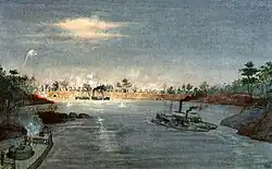 Two separate Paraguayan forces invaded Mato Grosso simultaneously. An expedition of 3,248 troops, commanded by Vicente Barrios, was transported by a naval squadron under the command of frigate captain Pedro Ignacio Meza up the Paraguay River to the town of Concepción.[13]: 25 There they attacked the Nova Coimbra fort on 27 December 1864.[13]: 26 The Brazilian garrison of 154 men resisted for three days, under the command of Hermenegildo Portocarrero (later Baron of Fort Coimbra). When their munitions were exhausted, the defenders abandoned the fort and withdrew up the river towards Corumbá on board the gunship Anhambaí.[13]: 26 After occupying the fort, the Paraguayans advanced further north, taking the cities of Albuquerque, Tage and Corumbá in January 1865.[13]: 26