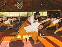 A twisting asana, Parivritta Parshvakonasana (reversed side angle pose), is obtained by reversing the direction of turn of the thorax.[6] The opposite elbow is brought to the forward knee; this is a useful preparatory pose. In the full pose, the hand is brought to the floor on the outside of the front foot, and the other hand is stretched forwards in line with the body over the head, with the gaze directed upwards.[7]