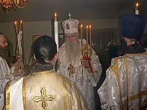 Eastern Orthodox bishop holding a paschal trikirion with two deacons (backs to camera) holding paschal deacon's candles