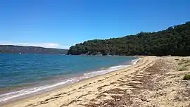 Patonga is a small and quiet bayside community occupying a one kilometre long sandy spit projecting from the rocky and elevated headland of the Brisbane Water National Park to the north through to the spit at the mouth of the Patonga Creek which feeds into the Hawkesbury River at Broken Bay. Patonga has both a beach frontage onto Brisk Bay to the east and a sandy foreshore on the creek to the west.