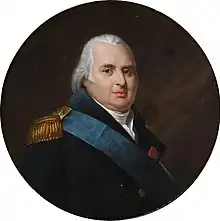 Around the end of 1795, Louis XVIII summoned Paul François de Quelen de La Vauguyon to Verona to be one of the four ministers that made up his conseil d'État. La Vauguyon followed this prince to Blackembourg. The counter-revolutionary plan to use conciliatory plans and in virtue of which royalists would still accept public posts can be attributed to him, but it proved too soft a plan. La Vauguyon rendered major services to the royal cause during his ministry and was Louis XVIII's main intermediary to his agents in France, notably in the La Ville-Heurnois conspiracy.[7] His time in the conseil d'État ended in February 1797 when, due to courtesans' intrigues, he fell into disgrace with the pretender, who his father had nicknamed "the disingenous". The count of Saint-Priest replaced him.[8] He then stayed for a time in Hamburg before returning to Spain, where he stayed until 1805. In that year he returned to France and lived in retirement until the Bourbon Restoration.